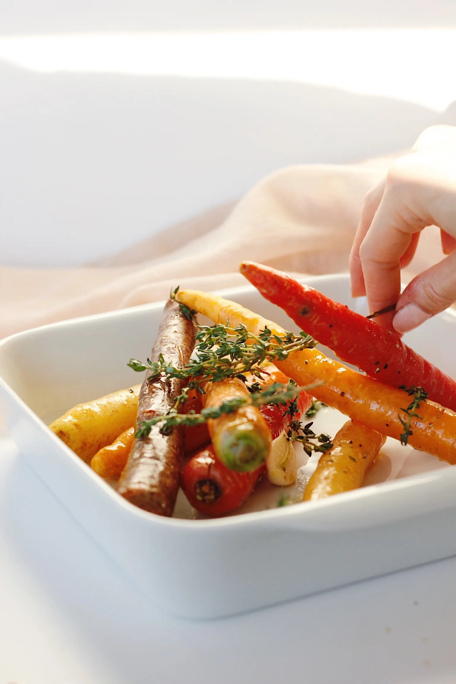 Ha gulrøttene over i en ildfast form å legg over hele kvister med timian og hvitløken som du har delt i to.