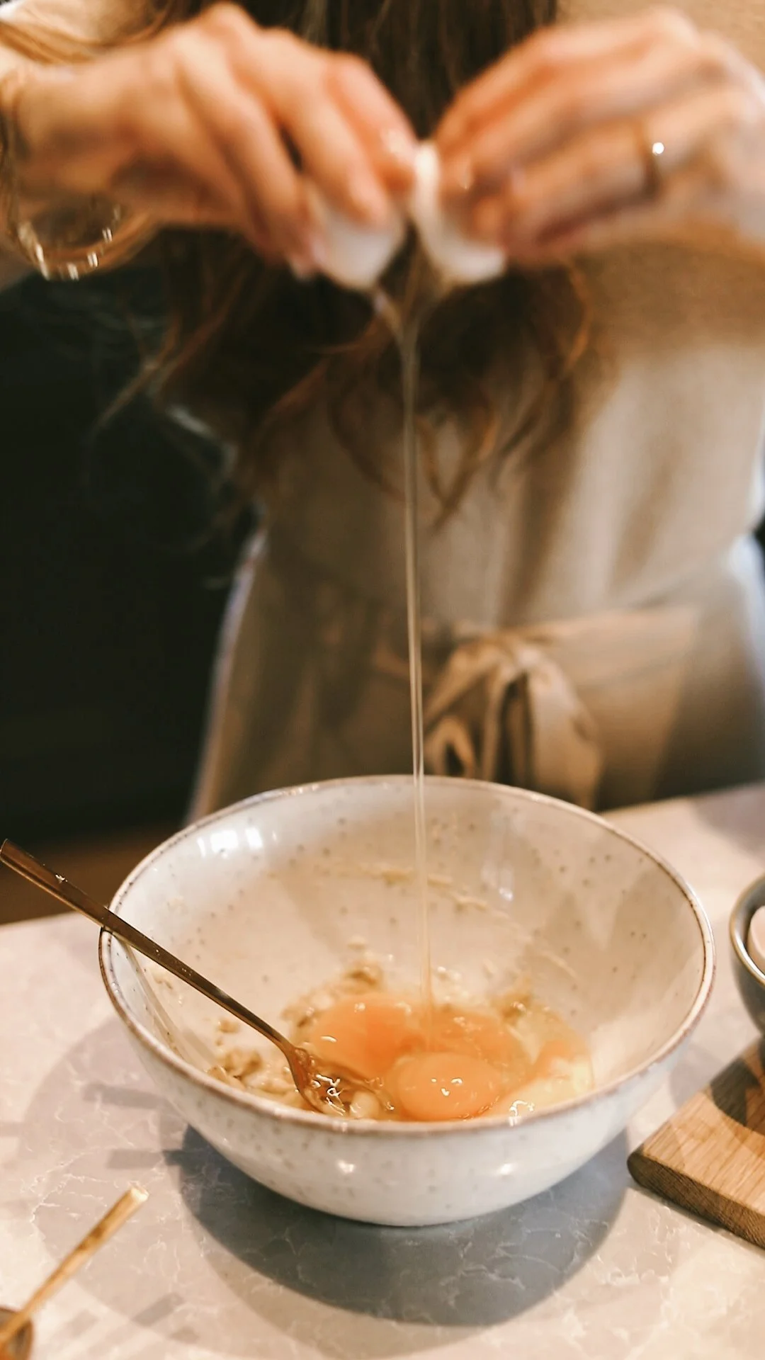 Ha røren i en stor bolle, og tilsett mandelmelet, kanel, ekte vanilje. Rør godt.