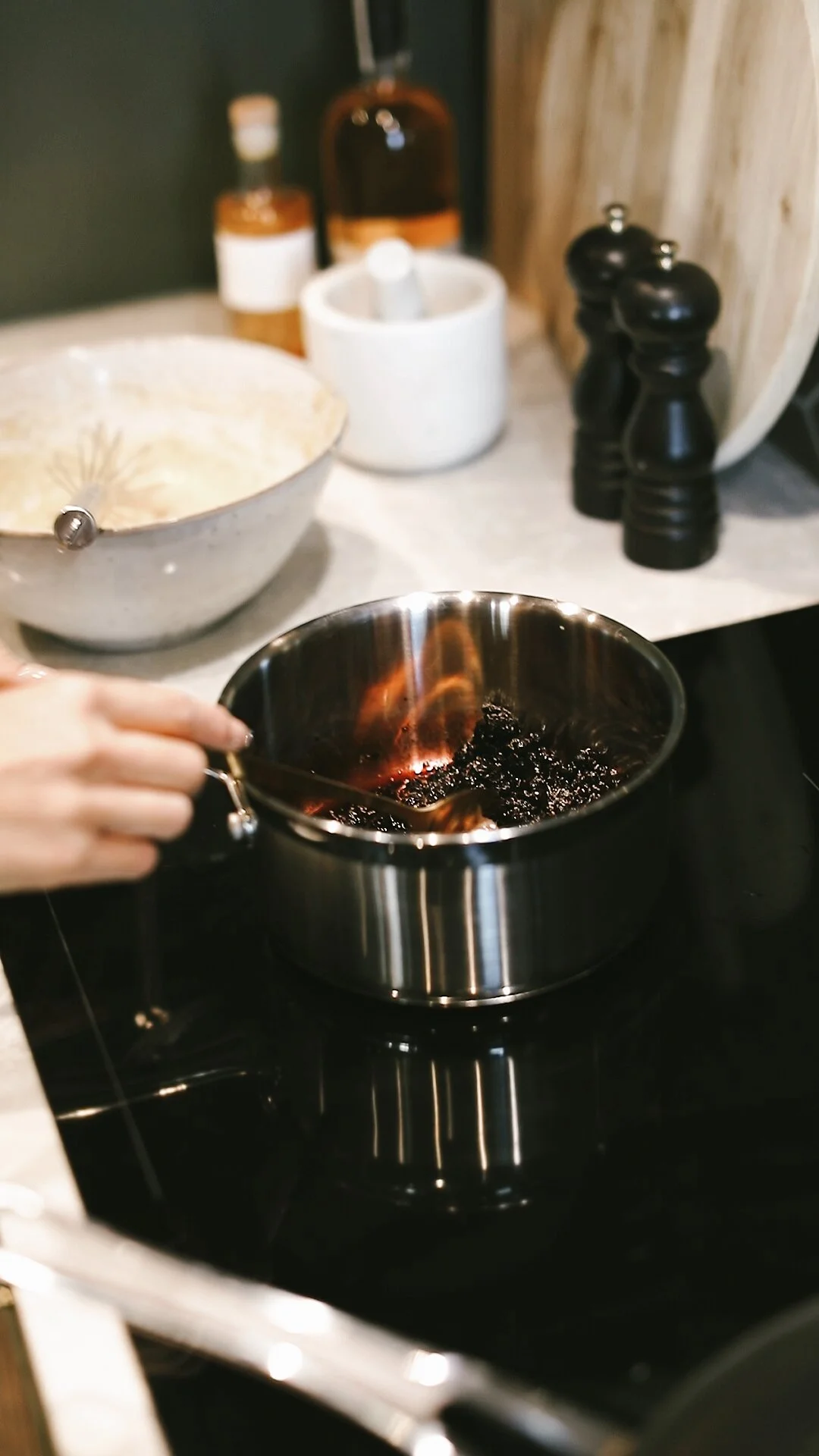 Samtidig som jeg steker pannekakene, setter jeg en kjele med fryste bær på lav varme, eventuelt litt kokosolje i kjelen. Når de har smeltet tar jeg i 1-2 ss chiafrø. Slik at væsken blir absorbert i frøene, og jeg har et fyldig chiasyltetøy.