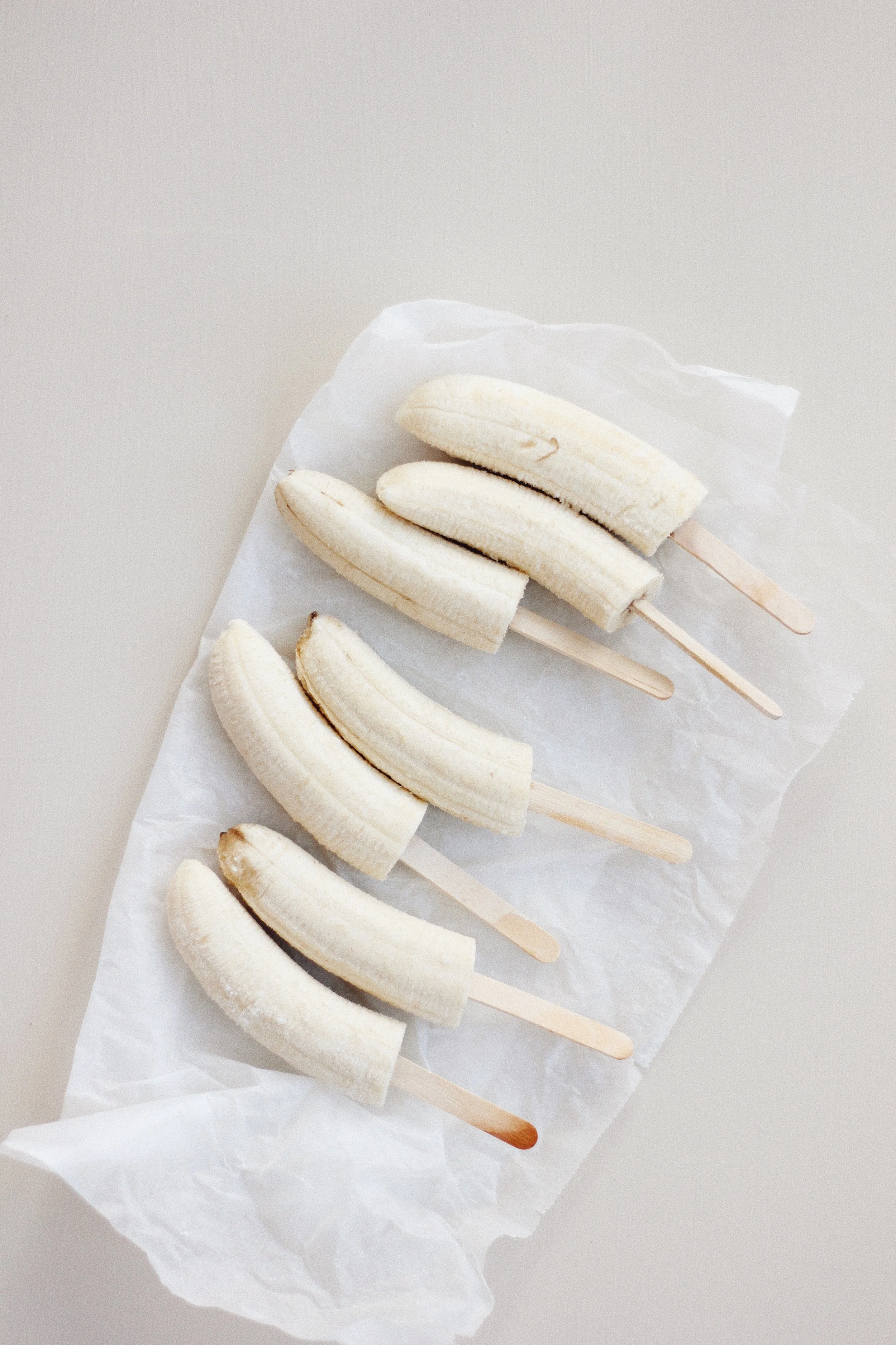 Skrell bananene og del dem i to. Ha i ispinnen.