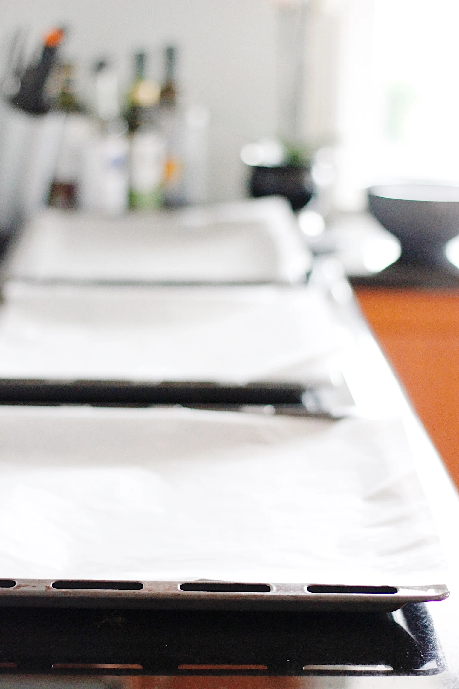 Ha dem i ovnen på 150 grader i 45 min. Etter 45 min, bruker du en pizza kutter og skjærer dem i ruter og skifter plass på brettene og lar dem stå i 45 min til i ovnen (sjekk etter 20 min).