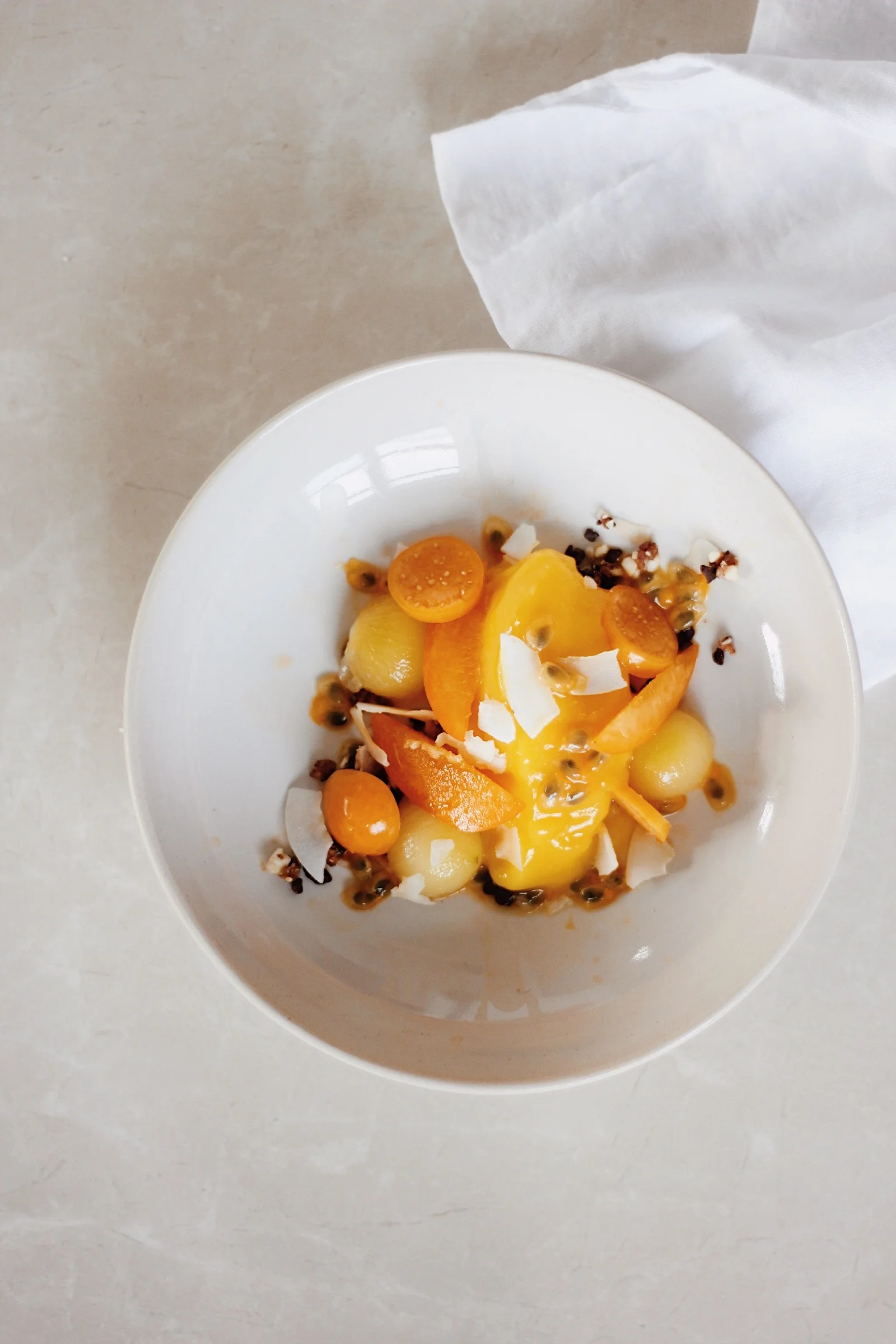 Ta ut mango sorbet av frysen og topp med toppings. Nyt!