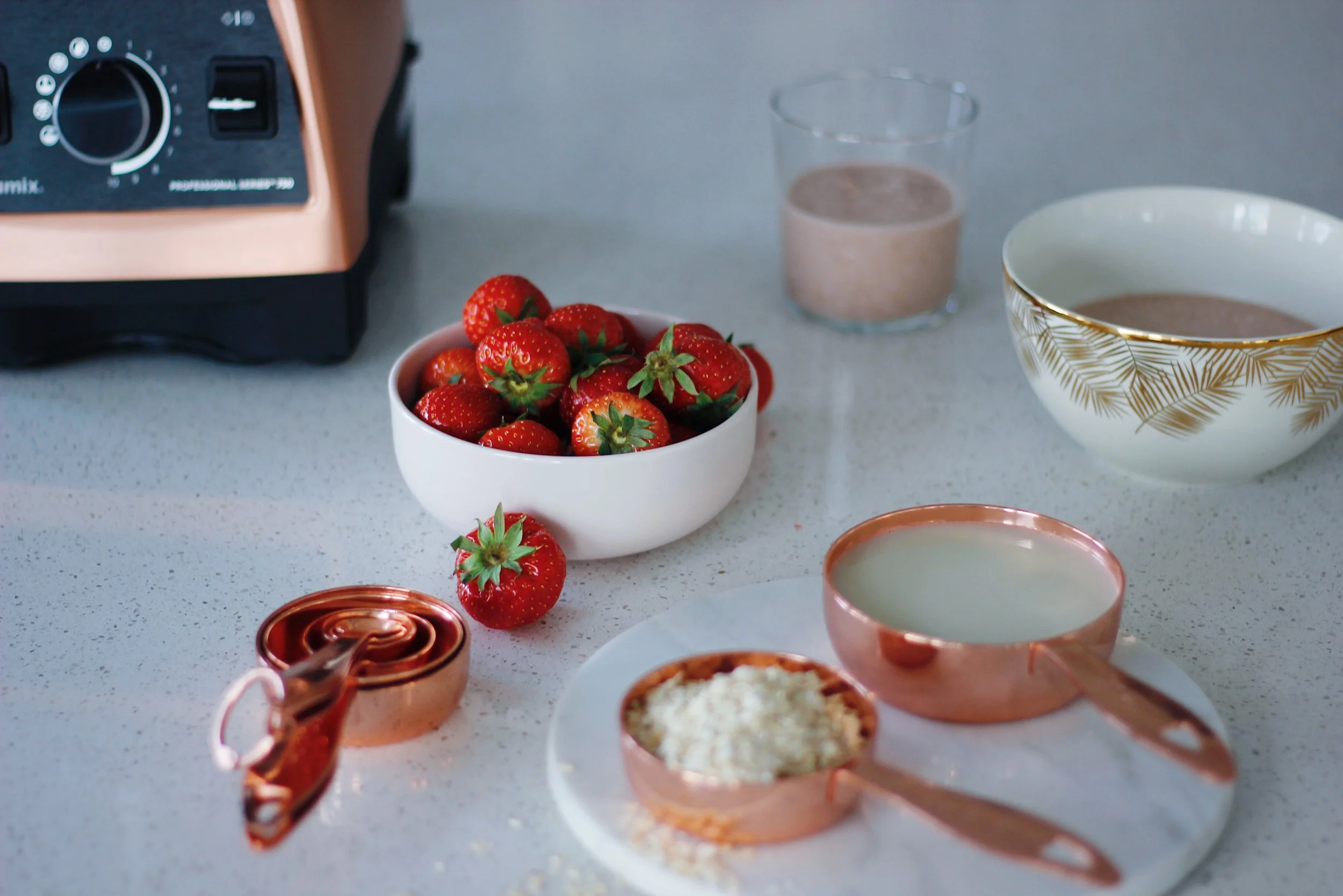 Ha havre melken i en blender å tilsett jordbærene. Ha i eventuelt søtning om du ønsker søtere smak på grøten.